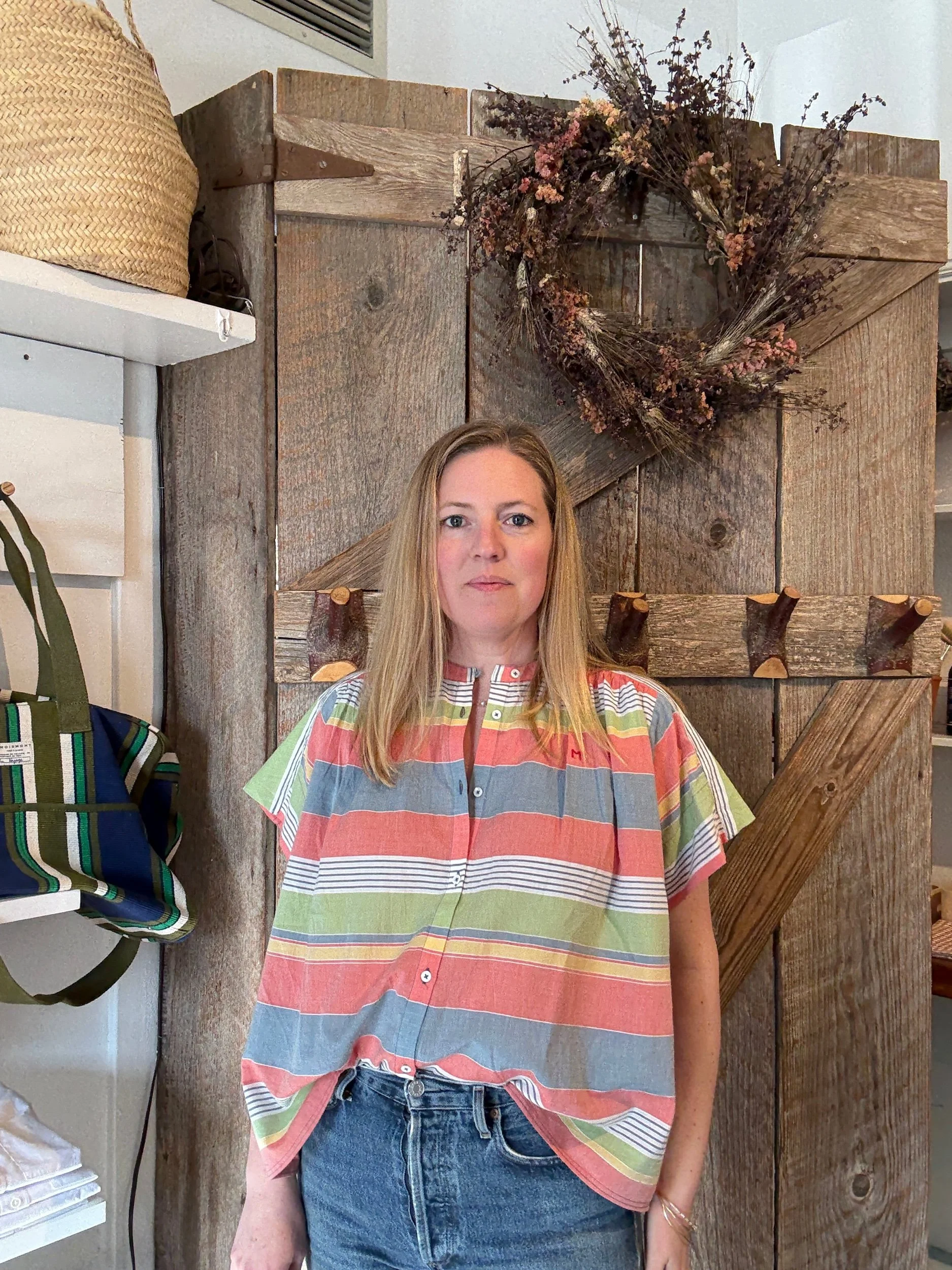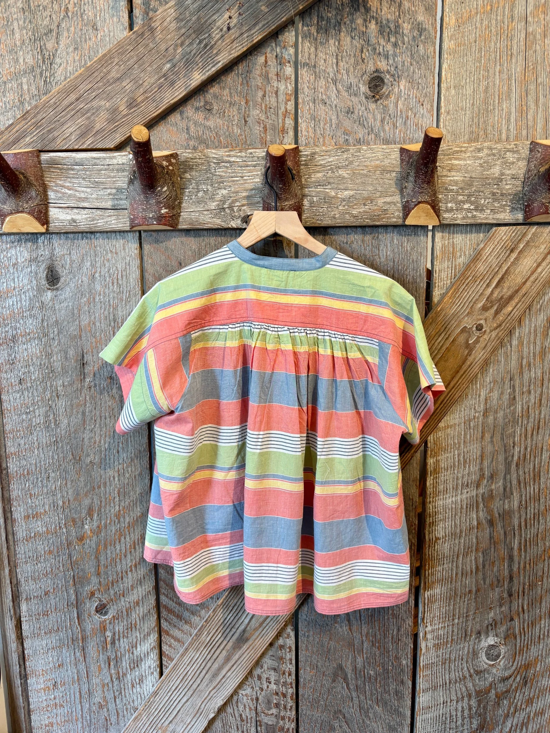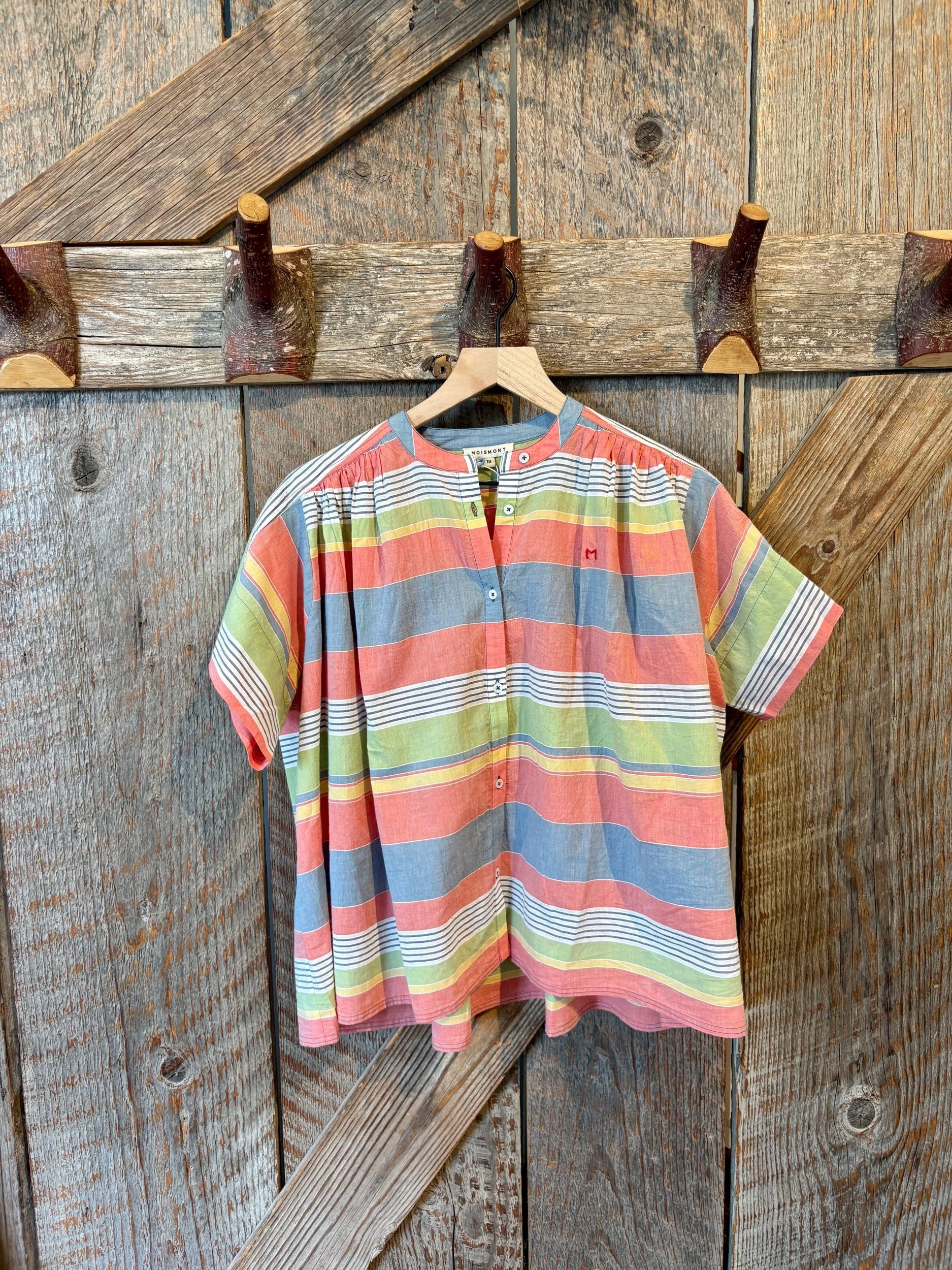 From French Moismont, the Max Blouse N°775 features a relaxed, flowing cut designed to move with you. Crafted from lightweight cotton voile, it's distinguished by its gathers at the neckline and back, which add volume and softness. Its round collar and visible button placket, punctuated with mother-of-pearl buttons, lend it a clean, minimalist look. Short sleeves and a discreet "M" embroidery complete this delicate and easy-to-wear piece, ideal for a fluid and natural silhouette.