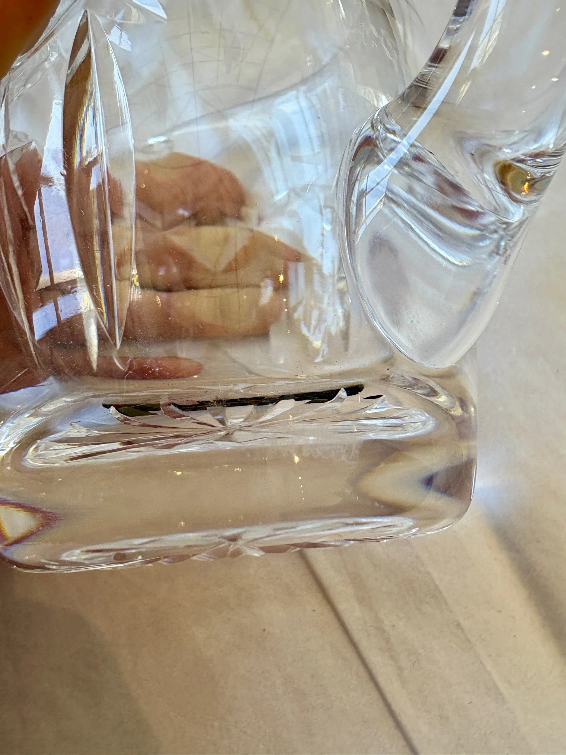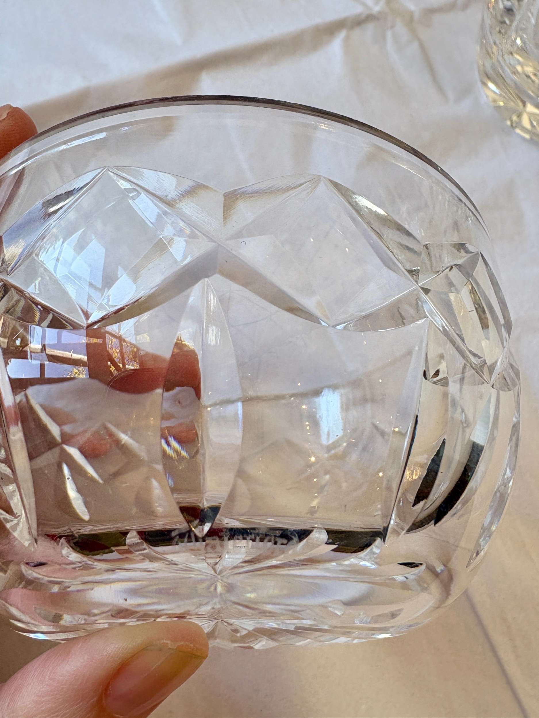 This is a sweet vintage Waterford cut crystal creamer and sugar bowl. Both pieces are stamped with an acid-etched Gothic font ‘Waterford’ indicating a date between 1950 and 1990. Crystal is a beautiful way to dress up your table with sparkle making the everyday feel special.