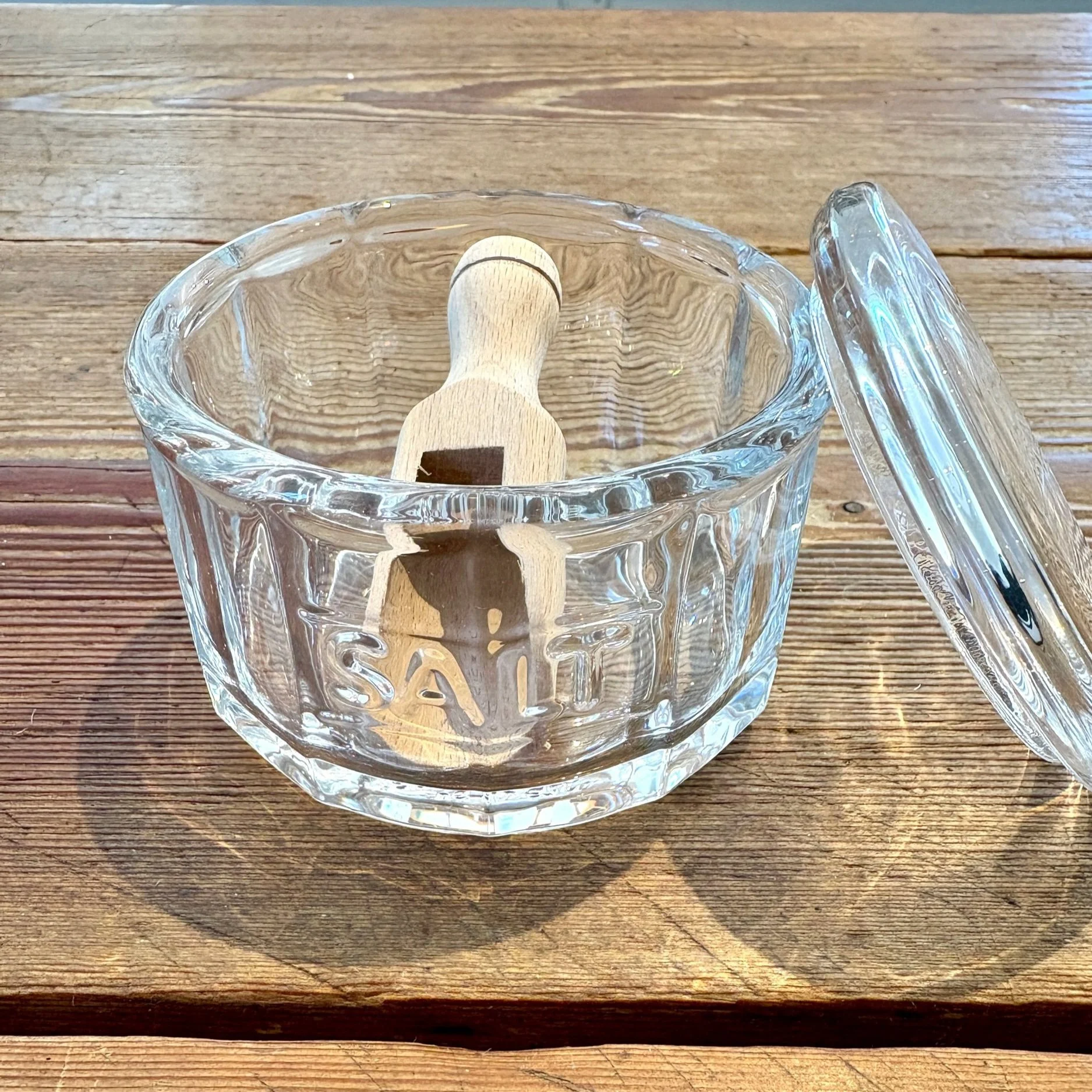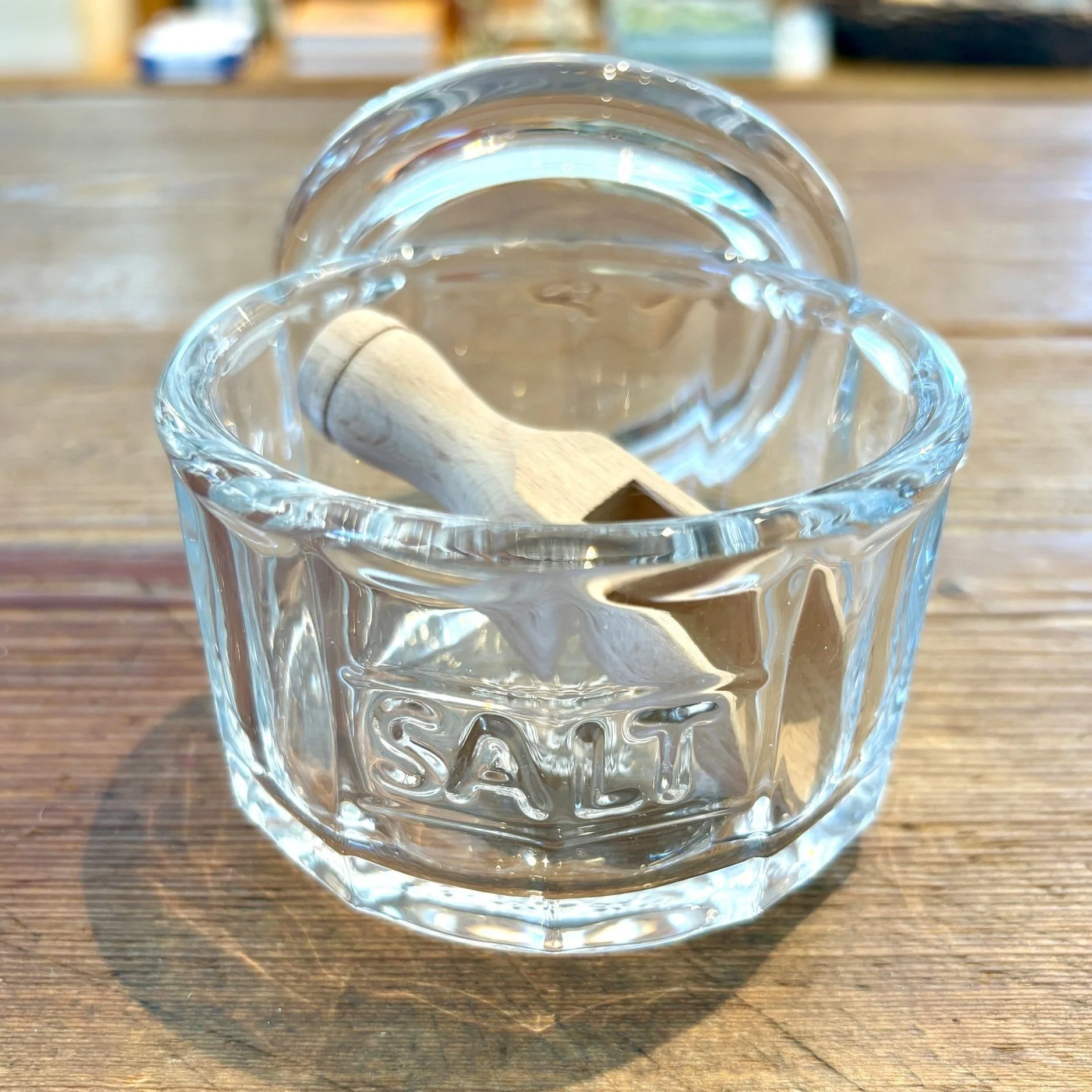 Retro styling, this clear glass salt cellar, will look great on any kitchen counter. The cellar is lidded and comes with a small wooden salt shovel. It looks great on your kitchen counter. Perfect to hold your favorite salt.