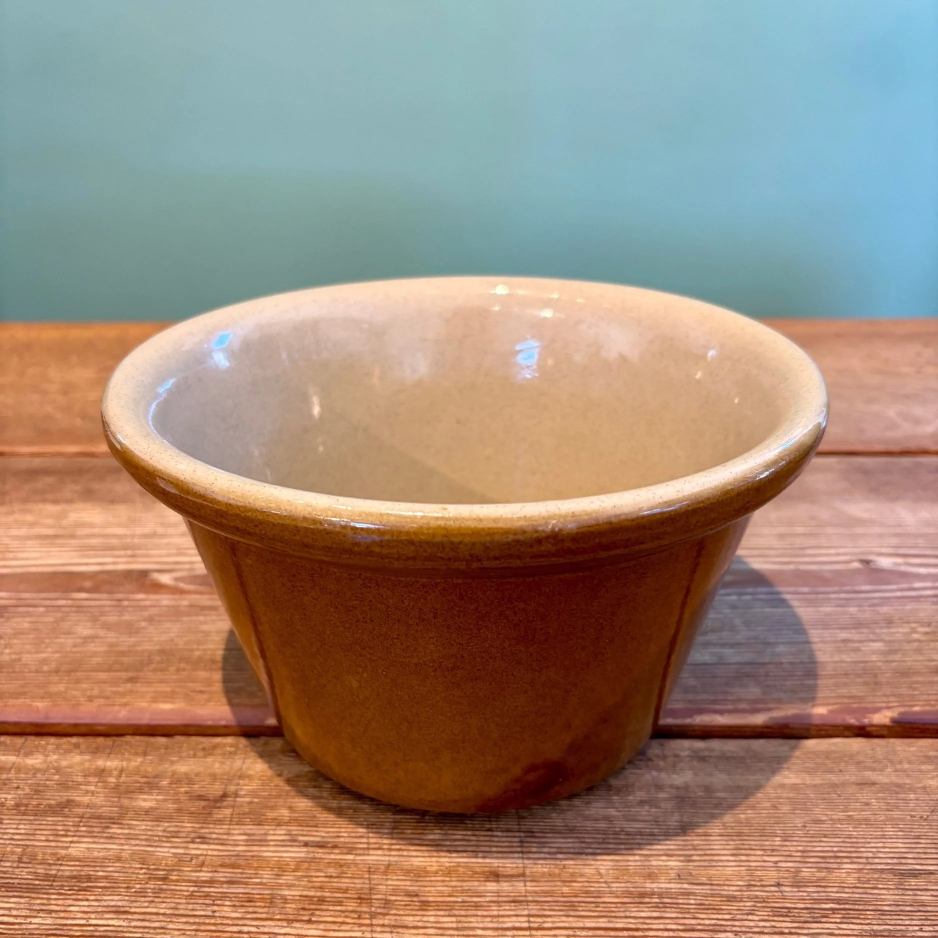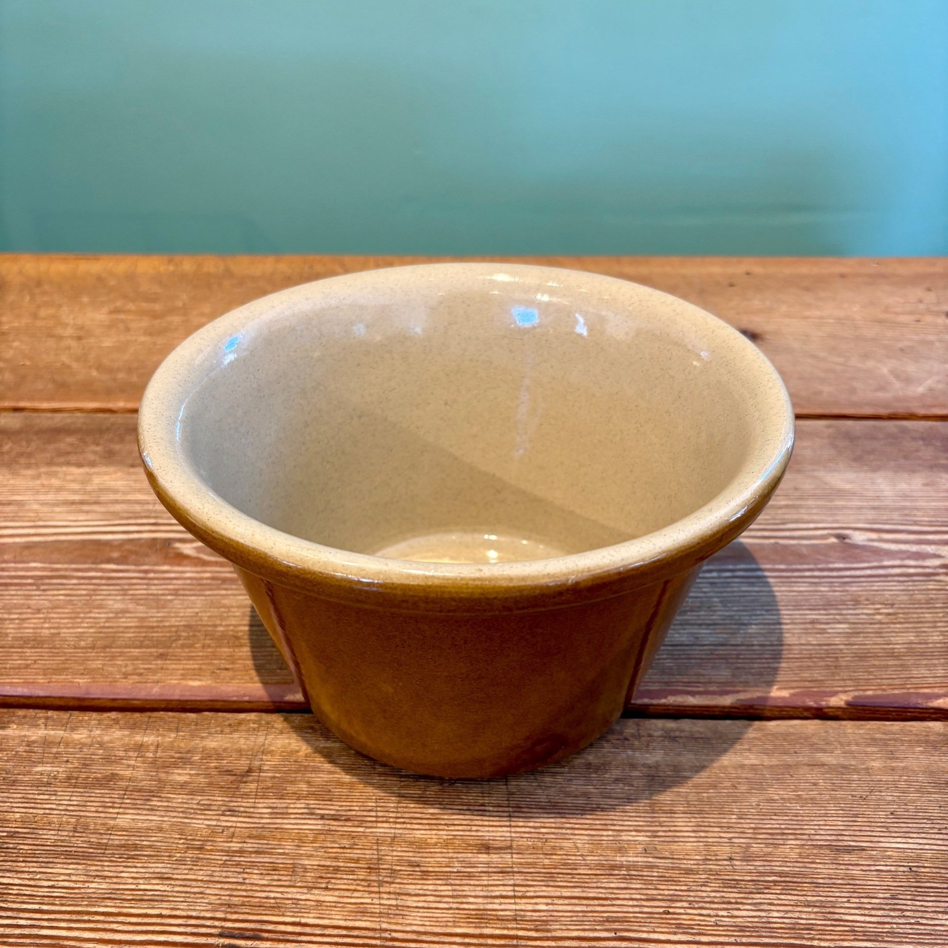 This vintage bowl is tapered in shape, being wider at the top than the base. It is salt glazed with a brown exterior and tan interior. It will look great on your kitchen counters or styled on open shelving for a timeless look. It is also a great size for making and serving dips, small salads, any other sides, or a fruit bowl. Stamped Made in England.