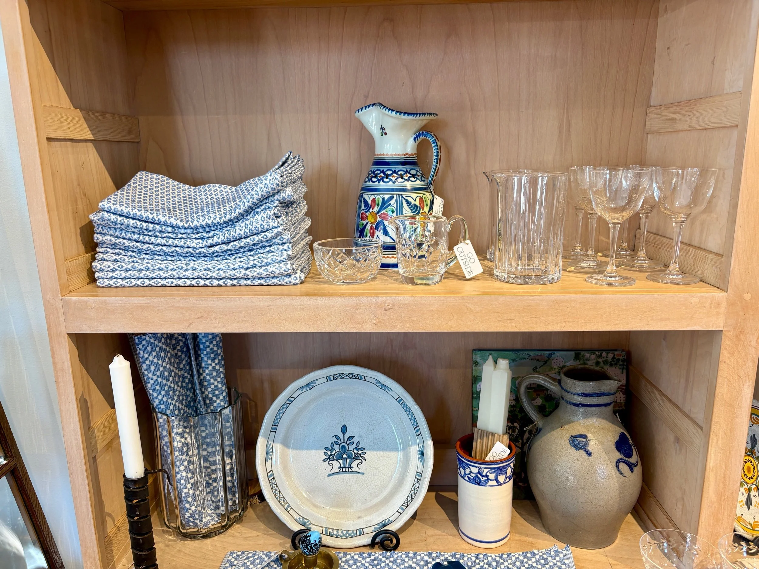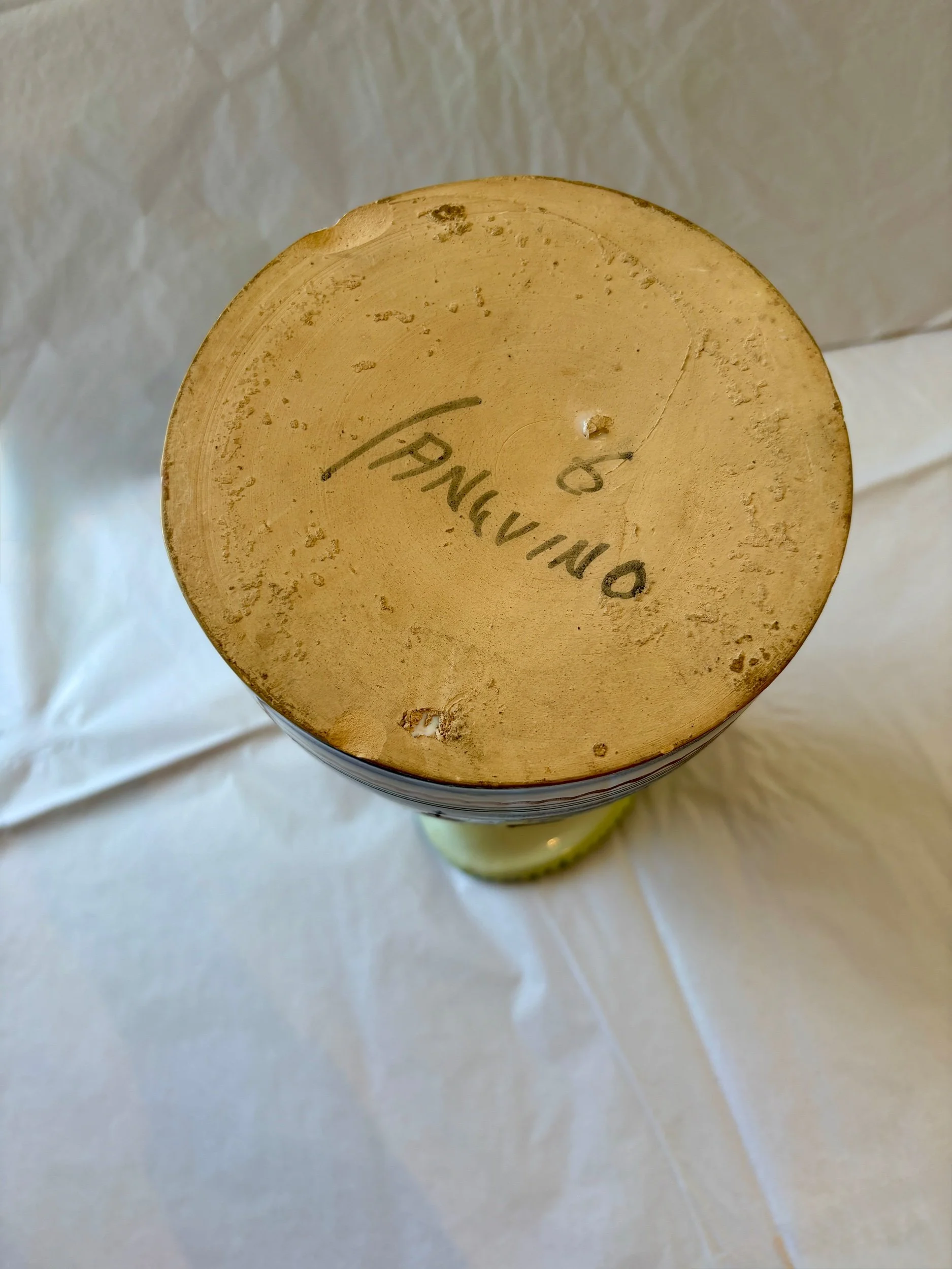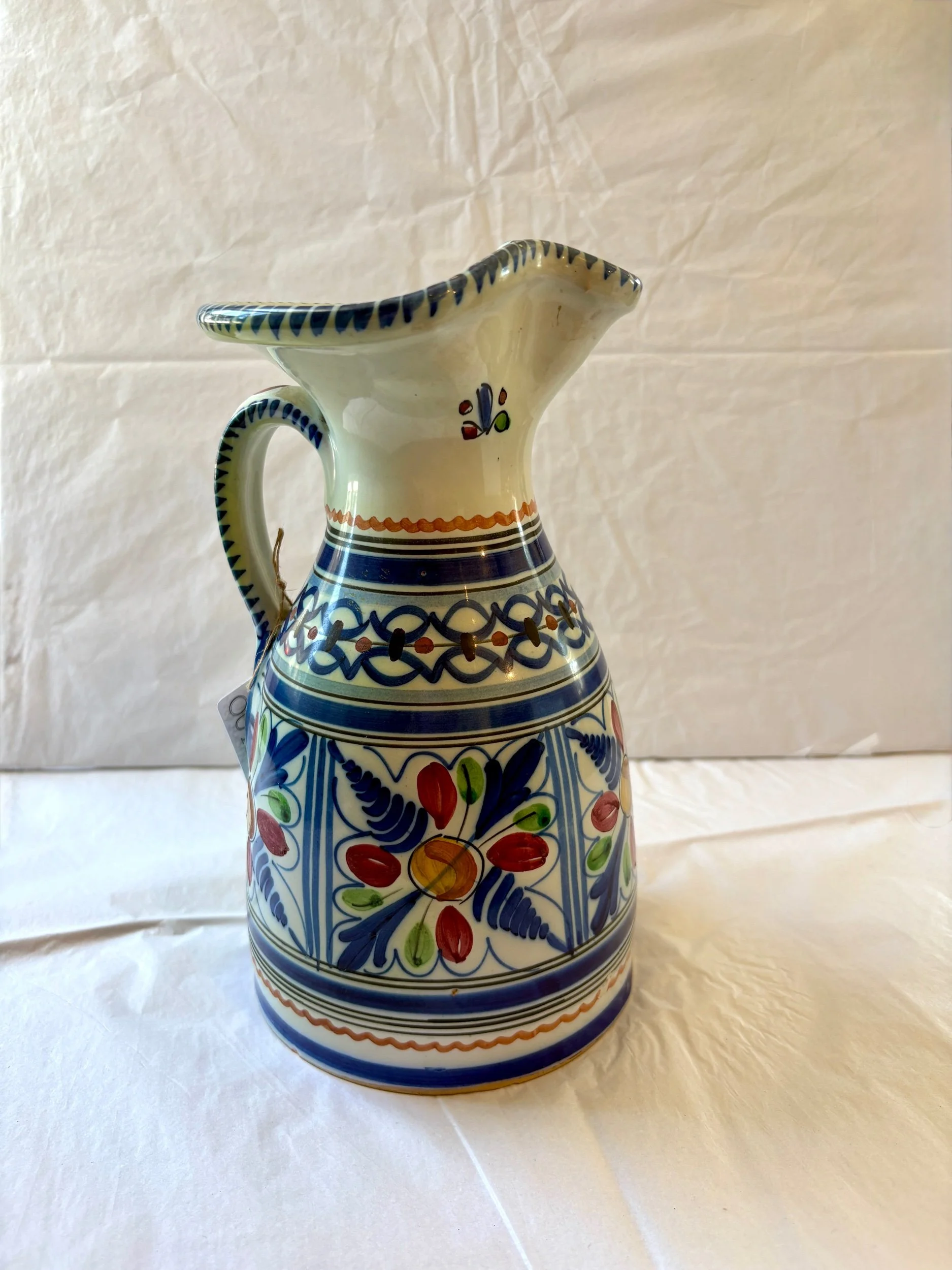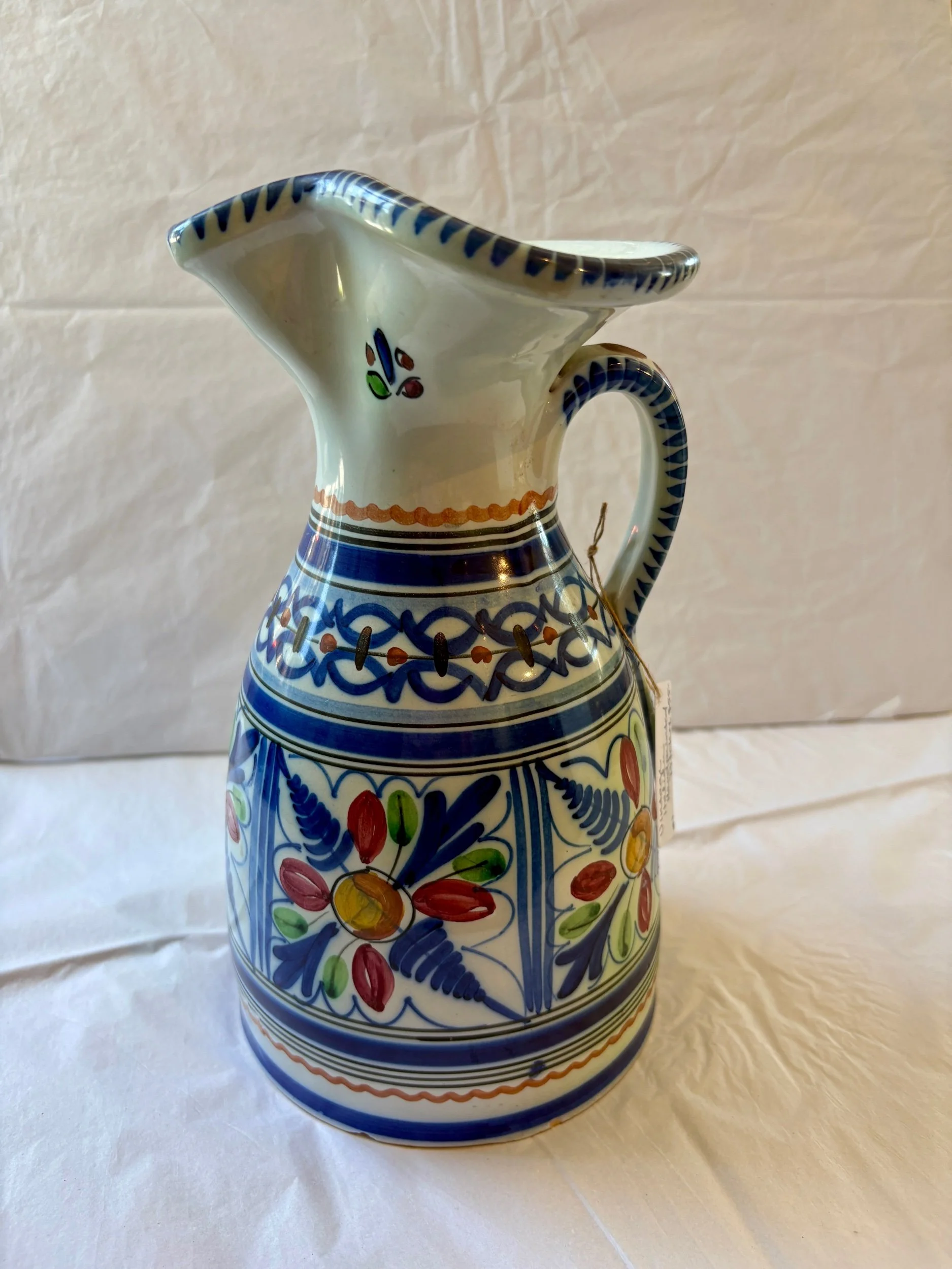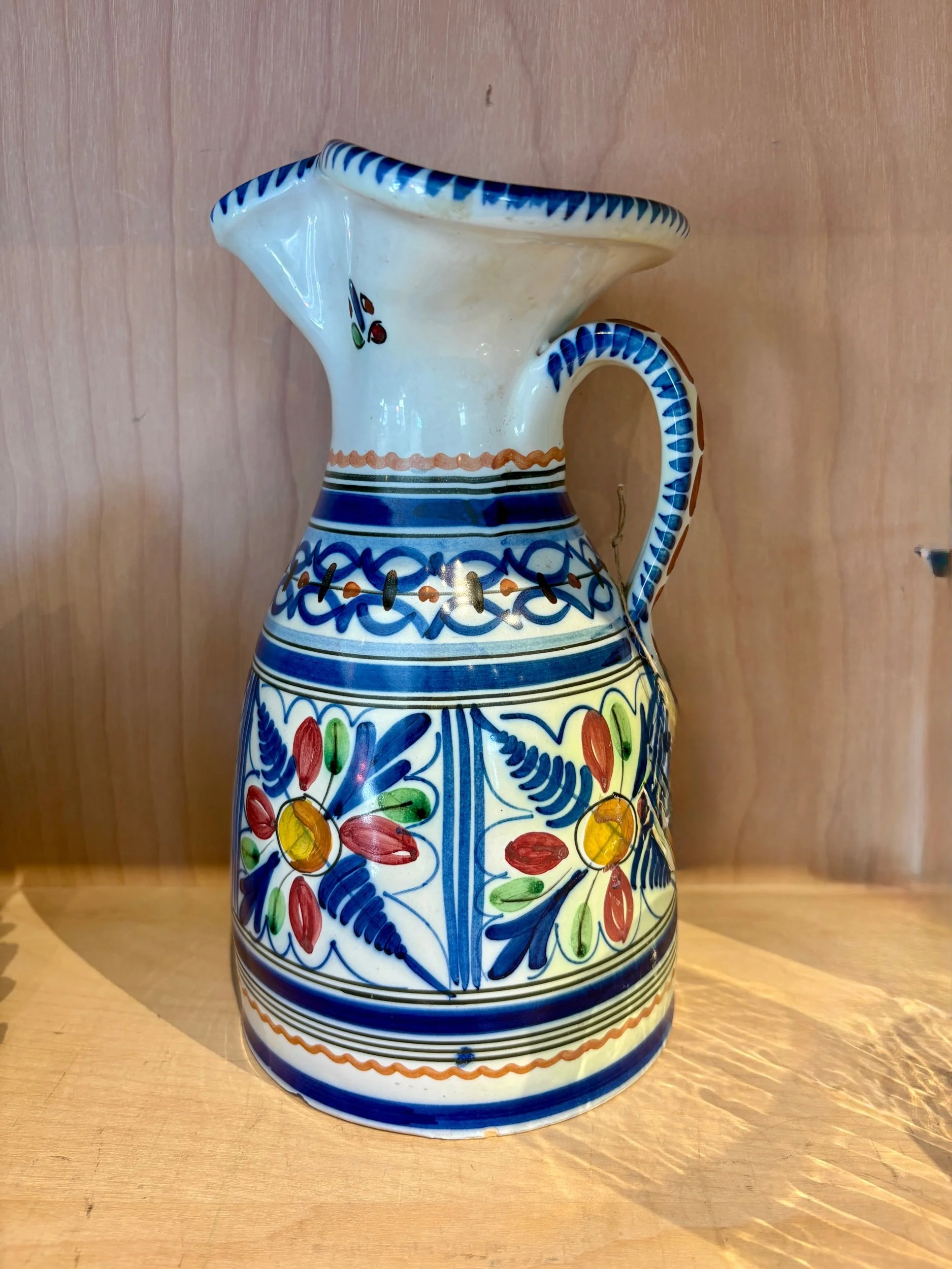 This Italian pitcher was found by mom in a French brocante deep in the rolling green French countryside. It is hand painted and is signed by the artisan. It is a beautiful jug with hues of blue, deep red, yellow, orange and green. It would make a wonder vase for fresh wild flowers, as a water jug for the table, or as an addition to a shelve scape in your home.