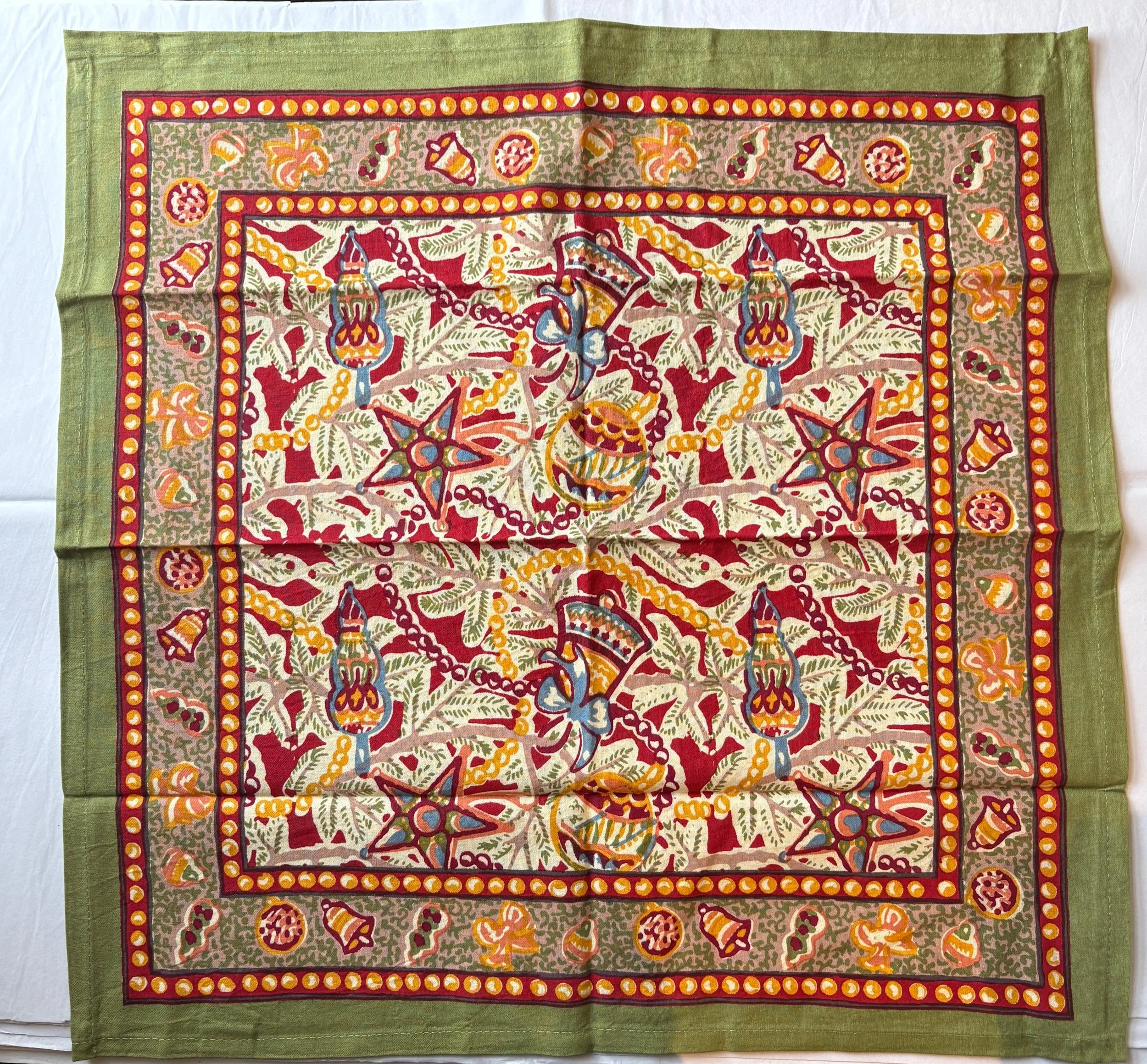 Combining a sense of casual festivity and tradition, this finely crafted French linen is a feast for the eyes with its array of finely detailed Christmas decorations. Featuring a holiday-themed pattern with an understated edge, this French linen brightens any room with simplicity and charm, and has been handprinted by skilled artisans using a time-honored technique.