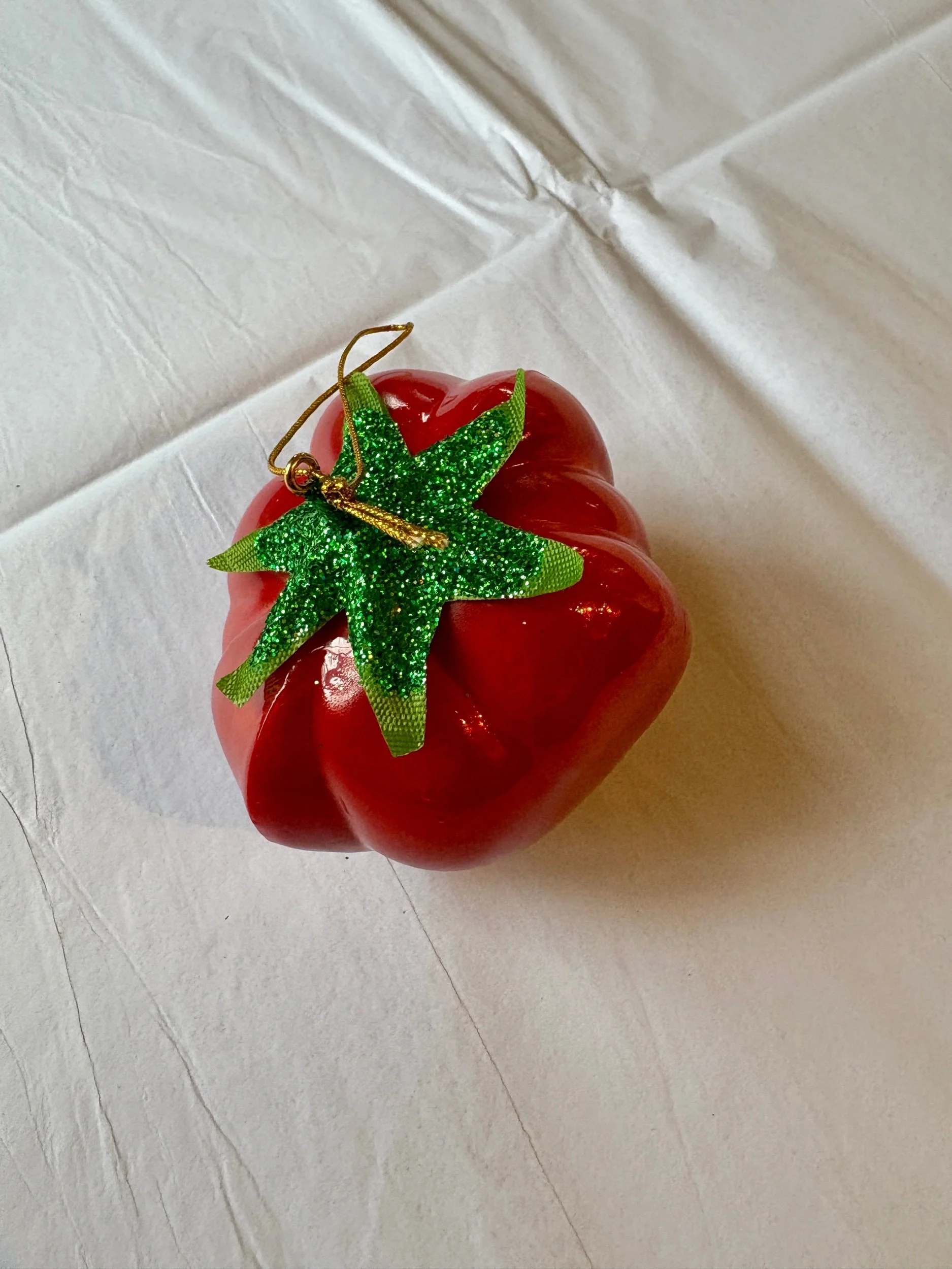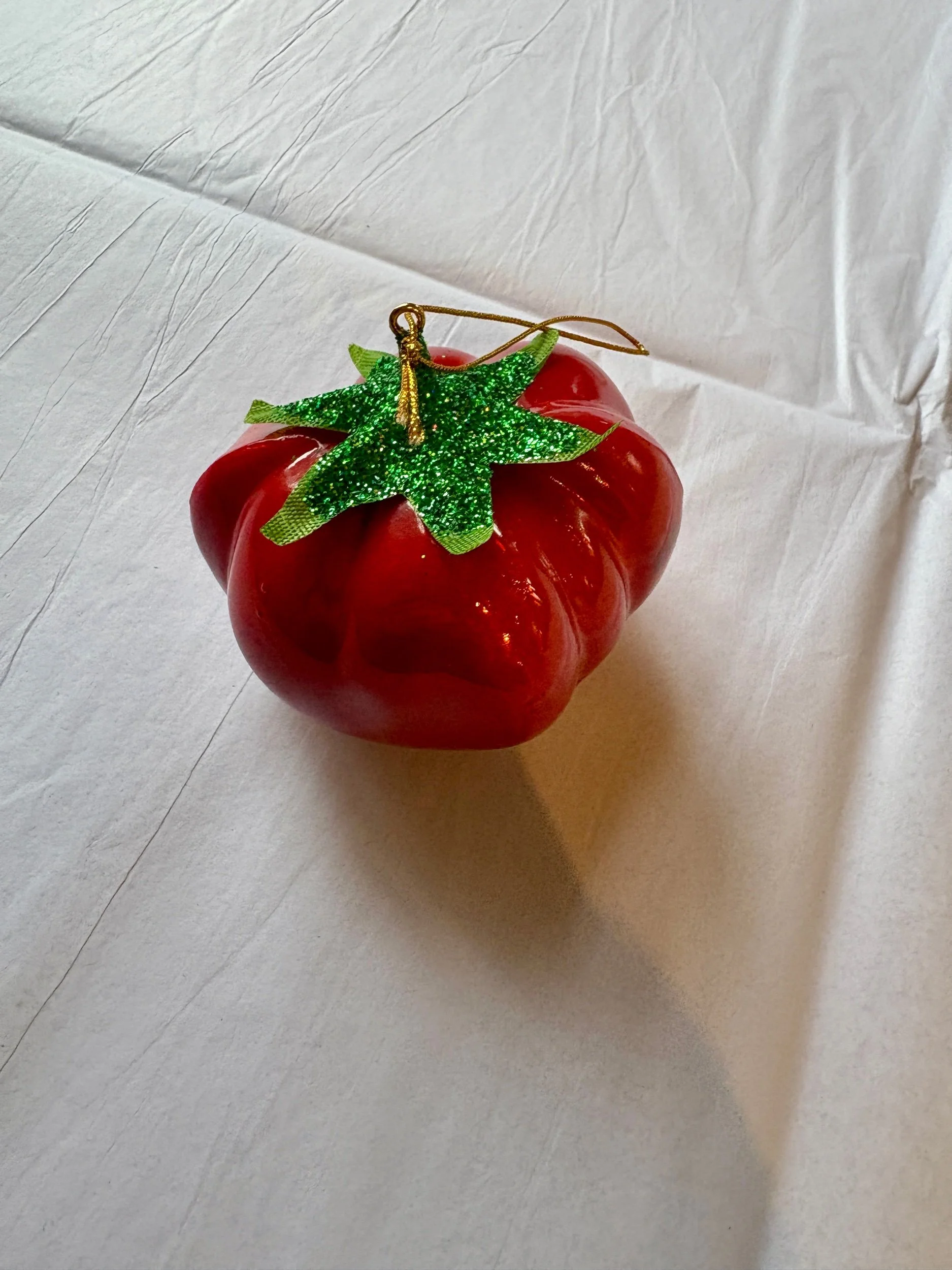 All The Goods › Tomato Glass Ornament Image 1 of 2 Image 2 of 2 Tomato Glass Ornament $14.00 Tomato glass ornament with green glitter. Quantity: Add To Cart Added! Tomato glass ornament with green glitter.